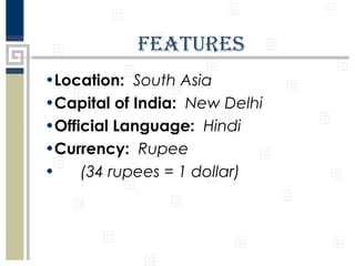 This document provides information about India across several sections. It begins with key facts about India such as its location in South Asia, capital of New Delhi, official language of Hindi, and currency of the rupee. Subsequent sections cover India as a subcontinent separated by the Himalayas, its major rivers and cities, its history including British rule and independence leader Gandhi, its agriculture and exports/imports, wildlife, climate and monsoon seasons, the Taj Mahal monument, religions practiced in India including Hinduism and Buddhism, traditional clothing like the sari, art forms like rangoli designs, popular leisure activities and games like kabaddi, and sports notably cricket.