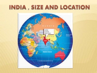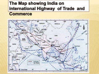 India has a central location in Asia between East and West, as a southern extension of the Asian continent. It shares land borders with 6 countries totaling over 14,000 km. India's contacts with other parts of the world have historically occurred through land routes in the Himalayas in the north as well as ocean routes, with the Himalayan passes providing important connections for ancient travelers.