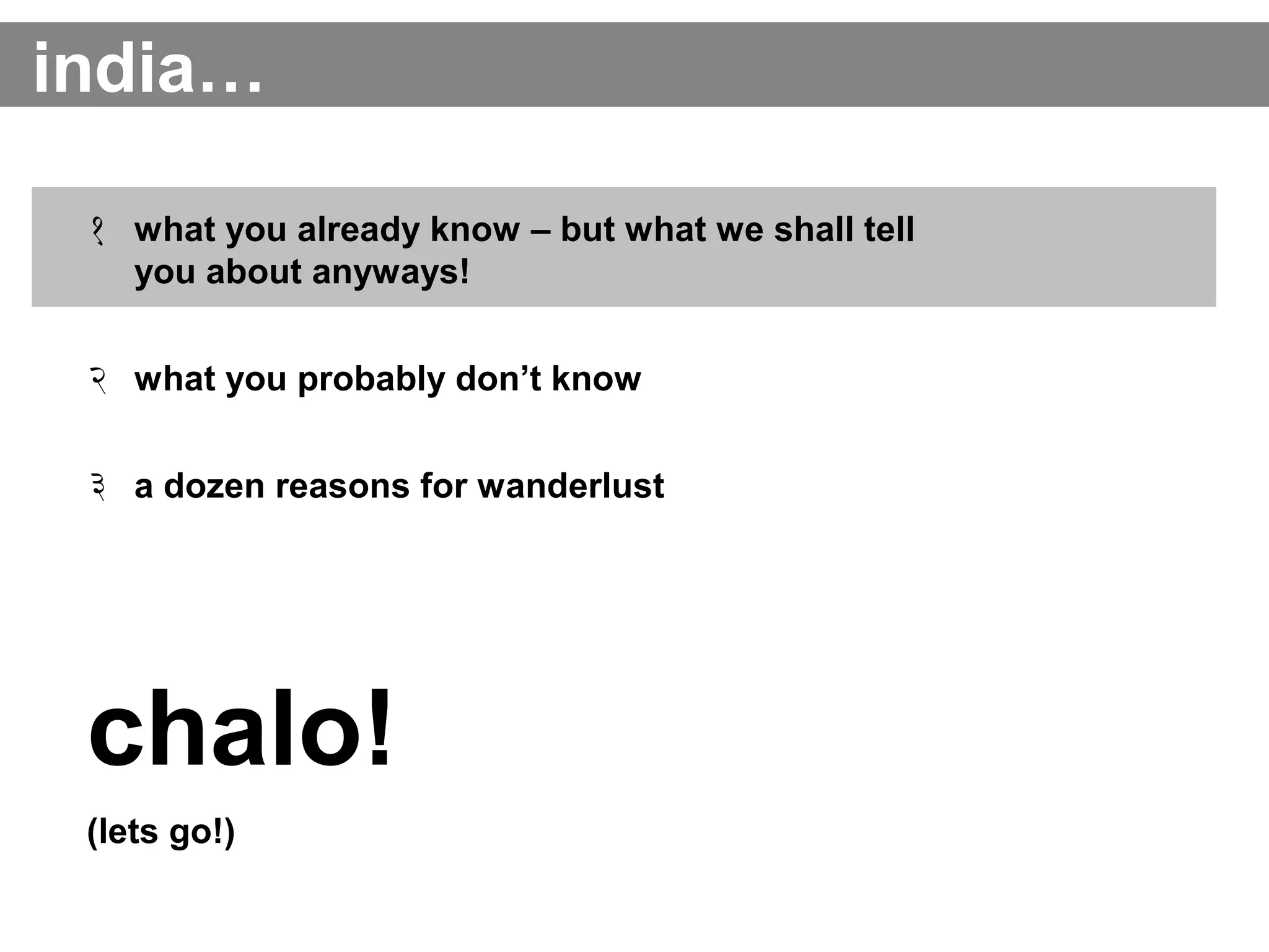 This document provides an overview of India, beginning with what is already known about the country and then exploring aspects that are less known. It discusses India's diverse population of over 1 billion people, rich history dating back 5000 years, vibrant culture and festivals, and natural beauty from the Himalayas to beaches. A dozen reasons for wanderlust to visit India are mentioned, including destinations like the Taj Mahal, Kerala backwaters, Ladakh, Varanasi, and Goa that showcase India's cultural and geographic diversity.