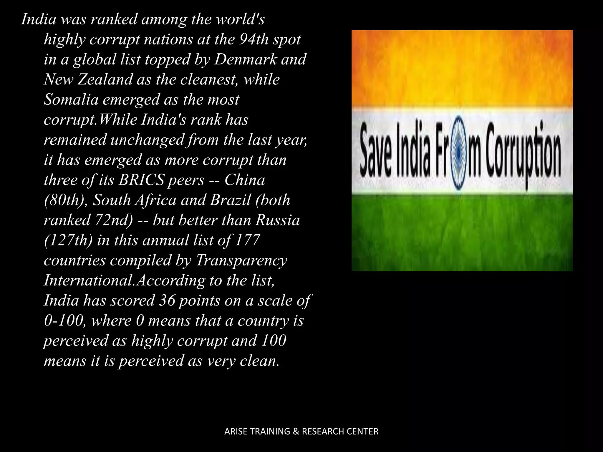 India was ranked 94th on the global corruption perception index for 2014, unchanged from the previous year. This index is compiled annually by Transparency International and ranks 177 countries from least corrupt (Denmark and New Zealand at 1st) to most corrupt (North Korea, Somalia, and Afghanistan at 177th). India scored 36 points out of 100, and was ranked as more corrupt than China, South Africa, and Brazil but less corrupt than Russia. The index showed that corruption continues to be a significant problem around the world.