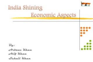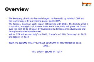 The document summarizes India's economic development over time. It notes that India will become the 3rd largest economy in the world by 2032 according to Goldman Sachs projections. India adopted socialist policies from 1947-1991, which led to slow growth. After adopting liberalization, privatization, and globalization policies in 1991, India's economy grew significantly faster. Major industries now include services, telecommunications, pharmaceuticals, and information technology.