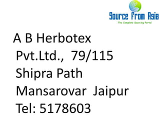 A B Herbotex Pvt. Ltd. is featured in the Source From Asia portal, focusing on sourcing Indian products and services. They provide a free sourcing and buying advisory for buyers. For inquiries, buyers can contact them via email or through their website.