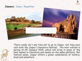 The document outlines a travel program in India for each month of 2015, highlighting recommended destinations and activities. Key highlights include attending the Jaipur Literature Festival in January, exploring the Valley of Flowers in July, and enjoying the Sunburn Festival in Goa in December. Each destination is chosen for its unique offerings and seasonal attractions, making it a guide for travelers seeking diverse experiences throughout the year.