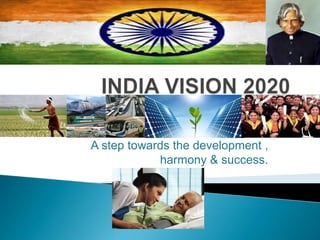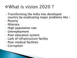 The document outlines India's vision to become a developed country by 2020. It discusses key areas of focus including education, agriculture, industry, infrastructure, and information technology. The former President of India, APJ Abdul Kalam, identified these five areas as critical to transforming India, along with reducing problems like poverty, illiteracy, population growth, unemployment, and lack of infrastructure. Many initiatives are underway in areas like education reform, agricultural development, industrial growth, infrastructure projects, and expanding IT and communication networks to achieve the goal of making India a developed nation by 2020.