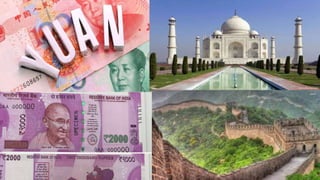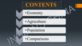 India and China have large populations and economies. India has a population of 1.3 billion and a mixed economy, while China has a slightly larger population of 1.7 billion and a socialist market economy. Both countries promote foreign investment and have large agricultural outputs, though China's total food grain production and GDP are higher than India's. Key differences are that India is a democratic country while China follows communism, and India has a better relationship with other countries compared to China.