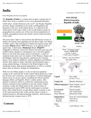 India is a country located in South Asia that has over one billion people, making it the second most populous country in the world. It has a long coastline and borders several countries. India has a very diverse population and landscape. It has a long history with many empires and was colonized by Britain in the 19th century before gaining independence in 1947. Today it has a large and growing economy and is the world's largest democracy.