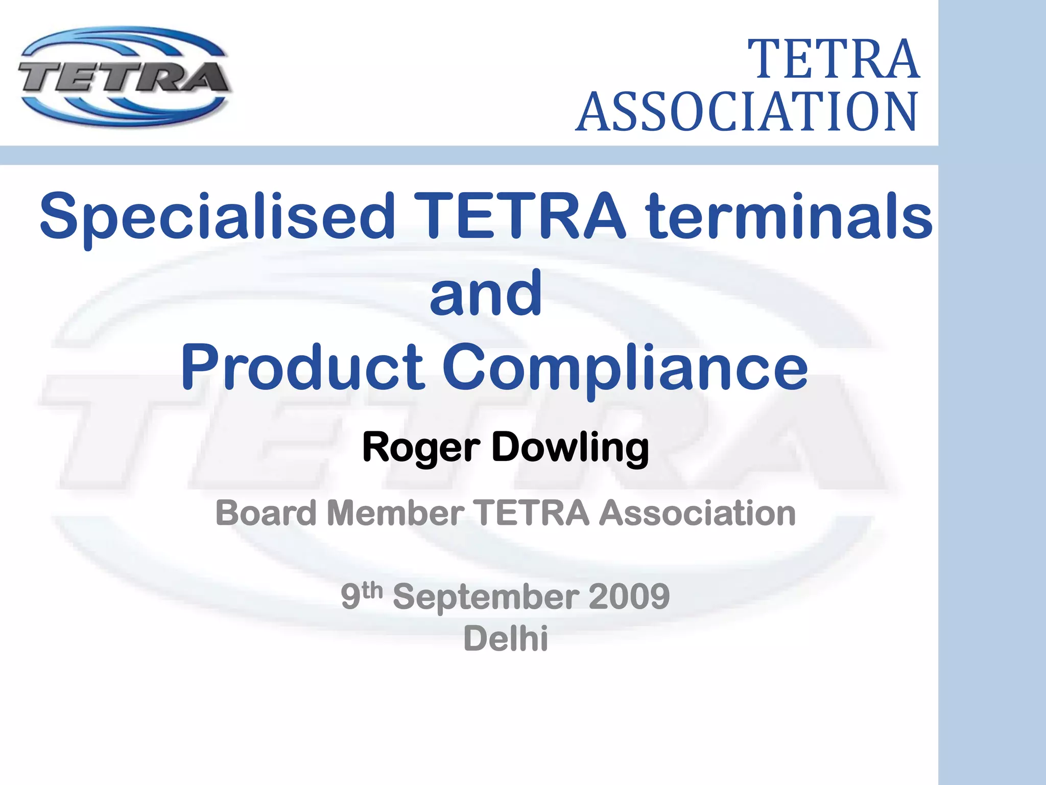 This document discusses TETRA terminals and extending network coverage using gateways and repeaters. It describes how gateways connect direct mode users to the trunked mode network, extending coverage. Repeaters are used to extend the range between direct mode users. The document provides examples of gateway and repeater applications. It also discusses product compliance and TETRA interoperability, noting that over 300 interoperability certificates have been issued to ensure equipment from different manufacturers can function together.
