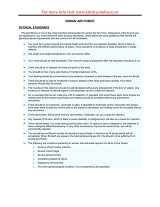 The document outlines the physical standards required to join the Indian Air Force, including additional standards for the Flying Branch. Some key requirements include:
