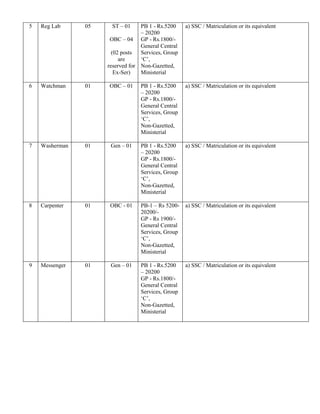 The document announces an employment notice for various posts at the Embarkation Headquarters in Mumbai. It details 9 posts available including Lower Division Clerk, Tally Clerk, Steno Grade III, and others. The notice provides information on the number of vacancies, reservations, pay scale, qualifications required, and selection process for each post. Candidates must submit applications with required documents by the deadline to be considered for the written exam, skill test, and interview which will be used to fill the positions based on merit.