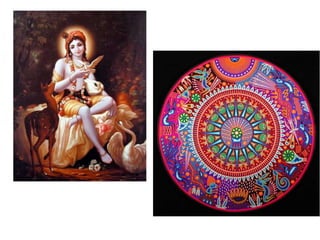 Indian art features curvilinear forms, nature motifs, and depictions of deities and culture. Sculptures and paintings show India's diversity and spontaneity through representations of all-encompassing culture. Indian art tells the story of India's oldest and most resilient culture, seen as a blend of indigenous and foreign influences over time.