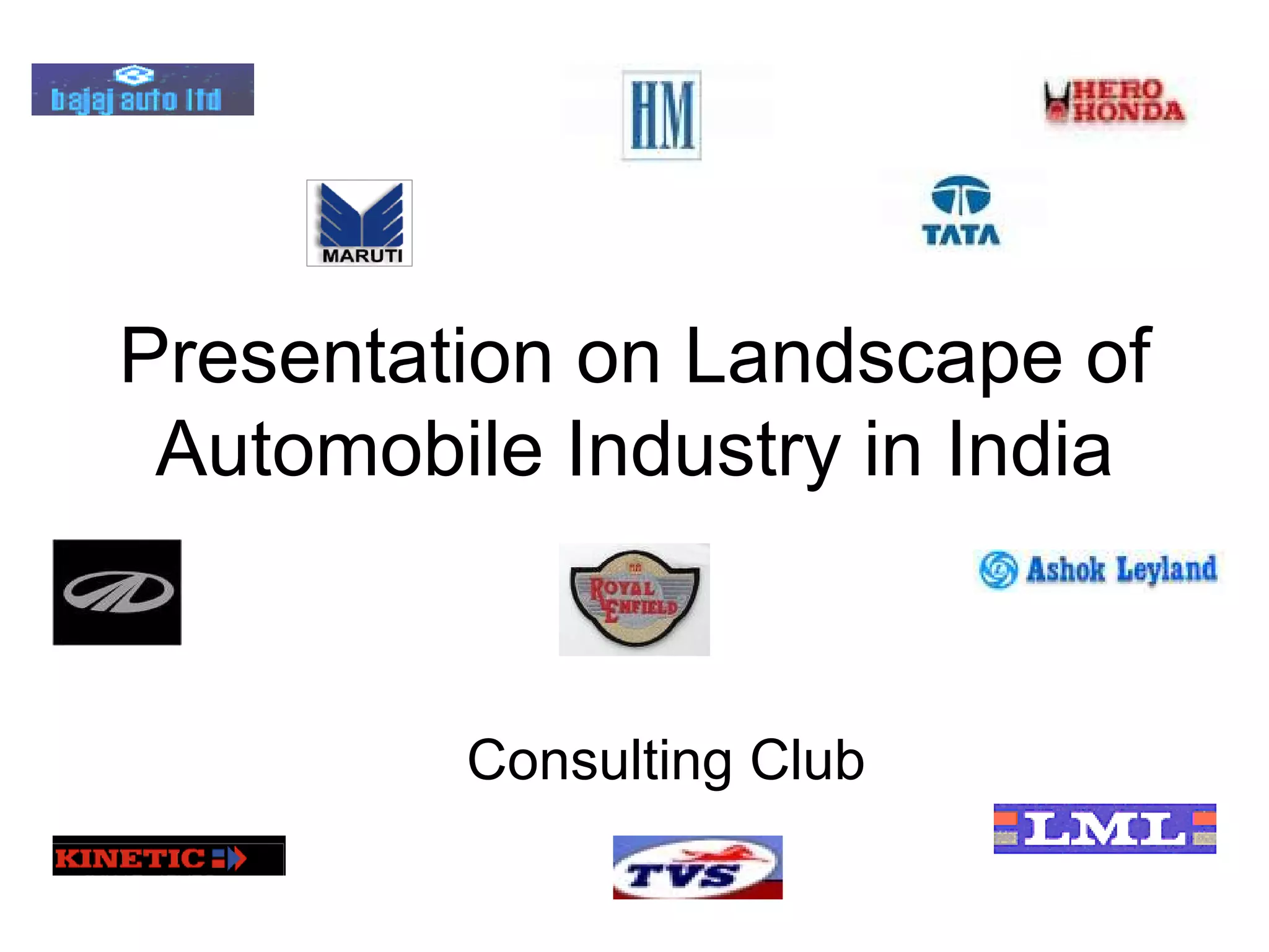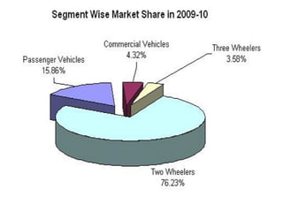 The automobile industry in India has grown significantly over the past few decades. It started with only two major players and was highly regulated, with import restrictions and high duties. Liberalization in the 1990s led to more players entering the market, both domestic and foreign, and greater competition. Key segments now include two-wheelers, passenger vehicles, commercial vehicles, and three-wheelers. The industry is largely domestically focused but exports have also increased substantially in recent years, with passenger vehicles becoming a leading export category. Overall production and sales have grown at a compound annual rate of over 15% with two-wheelers maintaining the largest market share.