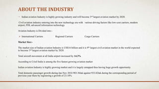 The aviation industry in India is highly growing and is expected to become the third largest aviation market by 2020. Key reasons for its growth include the expansion of low-cost carriers, modernization of airports, increases in foreign direct investment and advances in information technology. Currently, Indigo has the largest market share at around 40% and the top 4 airlines (Indigo, Jet Airways, Air India, and SpiceJet) combine for over 80% of the market. The government is taking steps like opening more regional routes and smaller airports to further develop the industry.