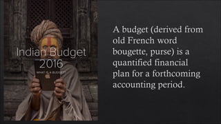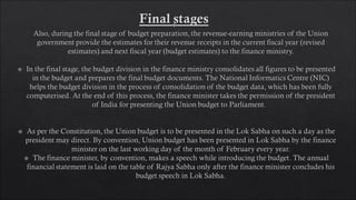 The document discusses key aspects of the Indian Union Budget. It defines the budget as an annual financial statement of estimated receipts and expenditures according to the Indian Constitution. It describes how the budget is classified into revenue and capital budgets, with revenue budget covering tax/non-tax revenues and expenditures for services, and capital budget covering receipts from loans and capital expenditures. It also outlines the budget formulation, enactment, execution, and legislative review processes.