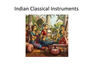 The document provides descriptions of several classical Indian instruments and instruments used in Gamelan ensembles. Some of the main Indian instruments described are the sitar with 20 strings used melodically, the santoor which is a dulcimer-like instrument with 25-30 string groups, and the bansuri bamboo flute which produces soft tones. Drums include the tabla pair of dayan and bayan which provide basic rhythms. Gamelan instruments highlighted include the bonang which plays notes based on the balungan melody, the saron and gongs which play important melodic and structural notes, and the kendhang hand drums which cue ensemble sections.