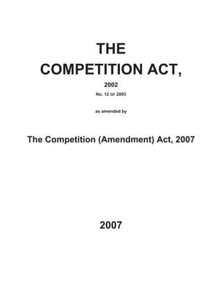This document is the Competition Act of 2002 from India, as amended in 2007. It establishes key definitions and provisions around competition law in India.