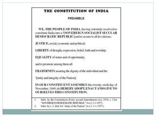 The document provides an overview of the salient features of the Indian Constitution. It discusses key aspects like the preamble, sovereignty, secularism, democratic republic, fundamental rights, federal structure, parliamentary democracy, emergency provisions, and more. The constitution is the longest in the world and has undergone several amendments since being adopted on November 26, 1949 and enforced on January 26, 1950.