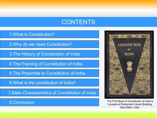 This document provides an overview of the key components and structure of the Constitution of India. It begins with definitions of what a constitution is and why countries need constitutions. It then discusses the history of framing India's constitution after independence, including the objectives of the Constituent Assembly and influences from other countries. The document outlines the preamble, parts, articles, amendments, schedules, and appendices that make up the structure of the Indian constitution. It describes the federal and unitary features of India's system and defines the constitution as the supreme law of the land.