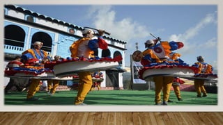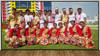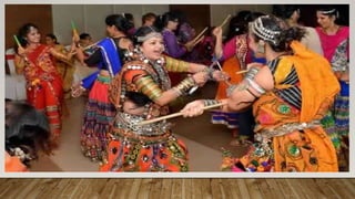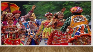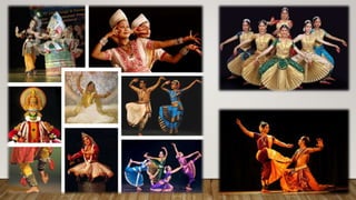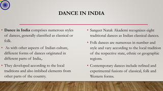Indian dances comprise numerous classical and folk styles originating from different regions. The eight classical styles recognized by Sangeet Natak Akademi are Bharatanatyam, Kathak, Kuchipudi, Odissi, Kathakali, Sattriya, Manipuri, and Mohiniyattam. India also has many folk dance styles which vary by state and region, such as Chhau, Ghoomar, Bhangra, Bihu, and Lavani. Indian dances developed from ancient roots as expressed in sculptures, epics, and texts like the Natya Shastra, incorporating music, drama, and spiritual ideas.