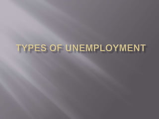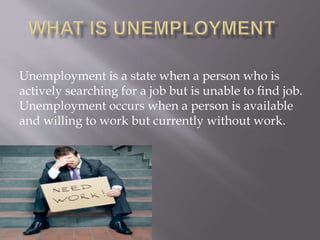 Unemployment occurs when a person is actively searching for a job but unable to find one. The unemployment rate is expressed as a percentage of unemployed workers compared to the total labor force. Unemployment rates in India were 5.6% in 2011 and 3.8% in 2014. Unemployment is typically higher in urban areas, among women, and the educated. It also tends to be greater in the agricultural sector than industrial or other sectors. There are several types of unemployment including voluntary, involuntary, structural, seasonal, frictional, and cyclic unemployment which occur due to different causes such as economic recessions, lack of skills matching jobs, or seasonal changes in demand for labor. Unemployment has negative impacts at