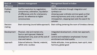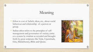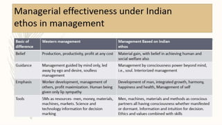 The document discusses Indian management practices and ethos. It defines Indian ethos as principles of self-management and governance revealed in Hindu scriptures. Key features of Indian ethos discussed are the divinity of human beings, balance, importance of character over knowledge, and seeing all work as worship. Indian ethos in management helps managers address problems creatively. The document also outlines challenges faced by Indian managers and discusses the meaning, need, importance and advantages of conducting management audits.