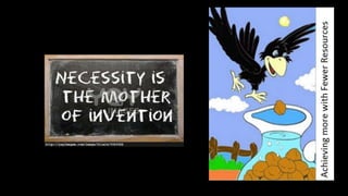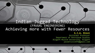 The document discusses frugal engineering, or 'jugaad', a philosophy aimed at achieving more with fewer resources, inspired by Gandhian principles. It outlines the importance of creativity, common sense, and questioning traditional methods to foster innovation, with examples including the Helios solar-powered vehicle and Google's unique search algorithm. Additionally, it highlights obstacles to creativity and presents successful case studies of frugal innovations in various sectors.