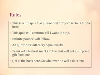 The document outlines the rules and format for a fun birthday quiz, featuring various trivia questions covering historical facts, notable personalities, and cultural references. It emphasizes that the quiz is not serious, is open-ended, and will conclude at the discretion of the quizmaster. Participants will compete for a surprise gift based on their scores and are to treat the quiz as an enjoyable activity rather than a serious competition.