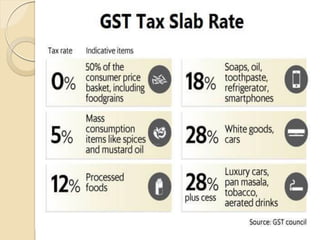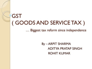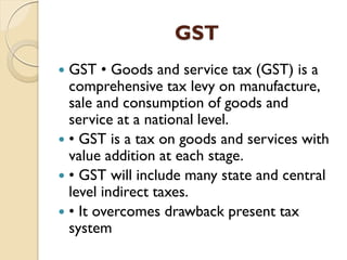 GST (Goods and Services Tax) is the biggest tax reform in India since independence. It is a comprehensive indirect tax on manufacture, sale, and consumption of goods and services throughout India. GST replaces many indirect taxes and aims to reduce tax cascading. It will simplify and harmonize the indirect tax regime in India. However, there were some hurdles in implementing GST, such as disputes between the central and state governments over tax sharing and the need for advanced IT infrastructure. Most countries have implemented some form of GST with rates typically between 15-20%.