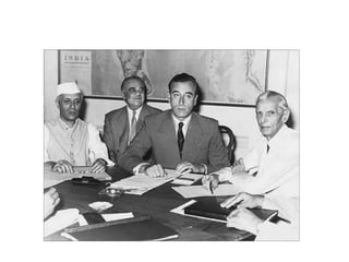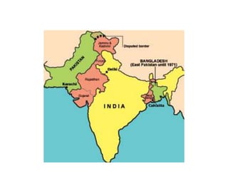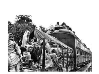 The document summarizes the challenges of Indian independence and partition in 1947 as seen through Nehru's speech from the Red Fort on August 15th. It outlines 3 challenges: 1) uniting a diverse society, 2) establishing democracy, and 3) ensuring development and well-being for all. It then discusses the two-nation theory that divided India into Hindu-majority India and Muslim-majority Pakistan, which led to the painful partition along religious lines. However, implementation was difficult as Muslim populations were not confined to single areas. Partition resulted in massive displacement, violence, and deaths as millions migrated across the new borders.