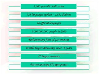 This document provides an overview of important religious texts, epics, and concepts in Hinduism. It summarizes the Rig Veda as the most important Hindu scripture containing over 1000 hymns, and the Upanishads as philosophical texts discussing concepts like Brahman. Two major Indian epics are also outlined - the Ramayana about Rama and the Mahabharata, said to be the world's longest epic. Key Hindu gods like Brahma, Vishnu, and Shiva forming the trinity are defined. Brief histories of important places and cultural contributions of India like yoga, martial arts, and its ancient university are presented.