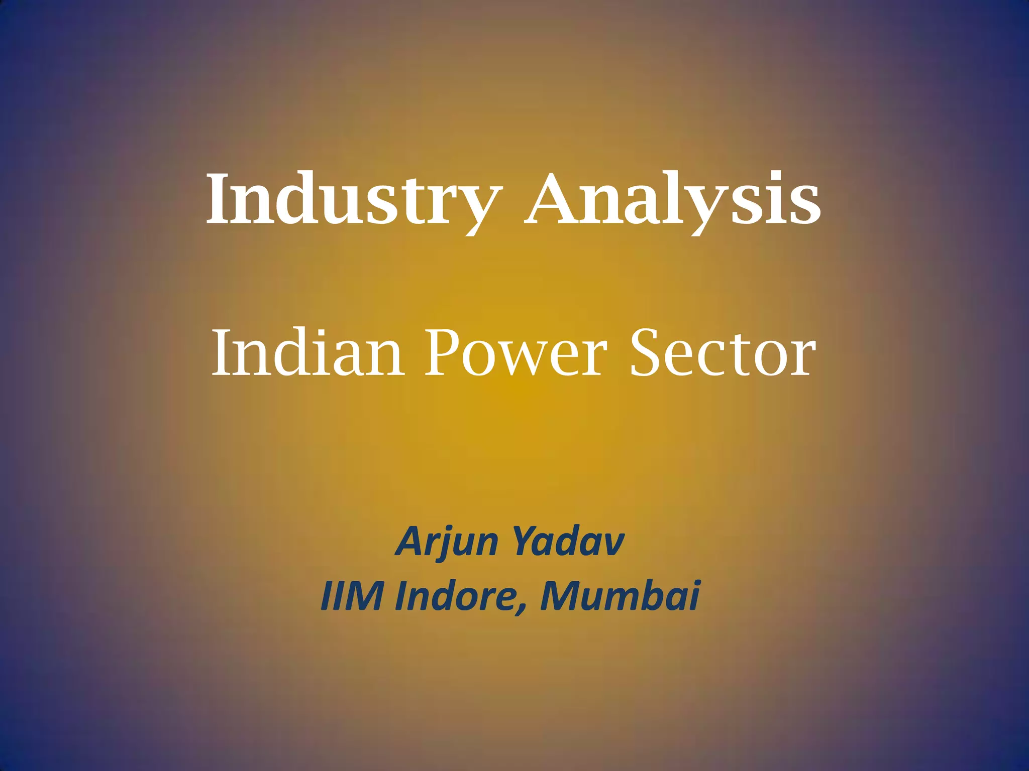 The document analyzes the Indian power sector, highlighting key success factors such as market positioning, regulatory compliance, cost management, and diversification. It emphasizes the impact of governmental policies, economic growth, technological challenges in CO2 reduction, and social issues affecting power demand. Additionally, it discusses market leaders like NTPC and Tata Power, detailing their capacities, roles in the value chain, and growth strategies.