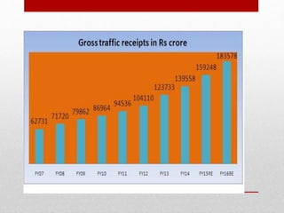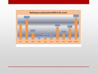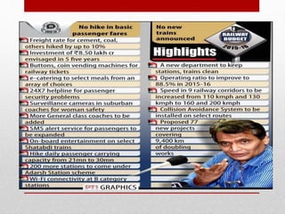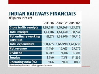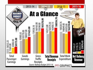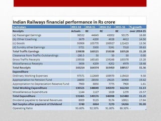 Suresh Prabhu presented the 2015-16 Indian Railway budget with a focus on safety, infrastructure development, passenger comfort, and making the railways self-sustaining. Key aspects of the budget included a proposed Rs. 8.56 lakh crore investment over 5 years, increasing daily passenger capacity to 30 million, and freight capacity to 1.5 billion tons by 2020. There were no increases to passenger fares. The budget aimed to strengthen the railways technologically, financially, and commercially through various new initiatives while focusing on critical areas like increasing connectivity in the northeast and Jammu and Kashmir regions.