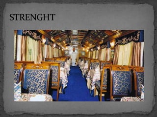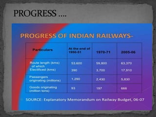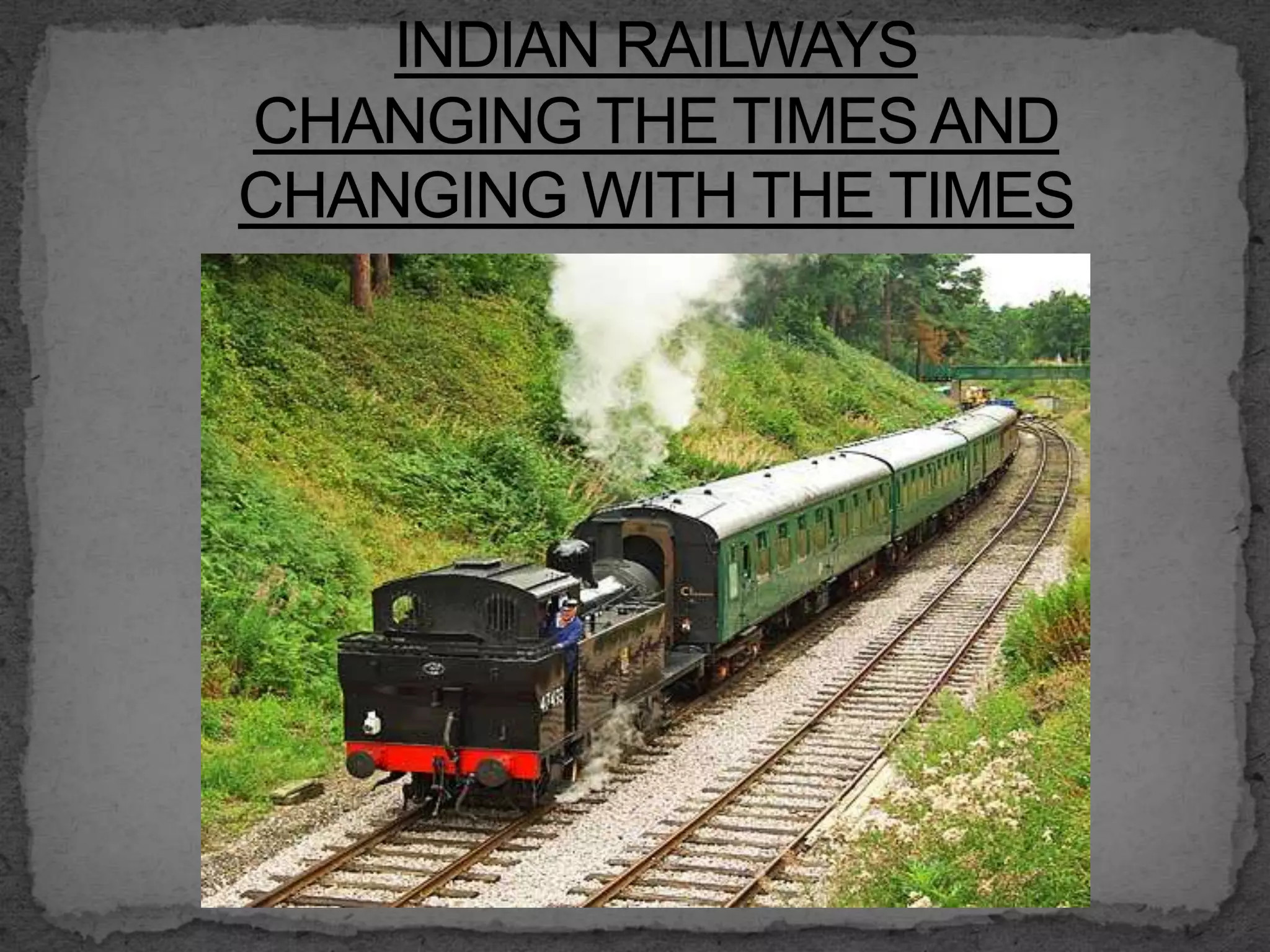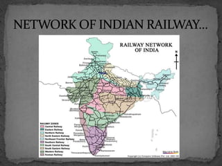 Indian Railways is the largest railway system in the world under a single management. It is 150 years old and carries over 11 million passengers daily on more than 7,000 stations across its 8520 trains. It is also the largest civilian employer in the world with over 1.7 million employees. While Indian Railways has faced challenges like delays and corruption, it continues to expand its network and adopt new technologies to improve customer satisfaction and remain the primary mode of long distance transport.