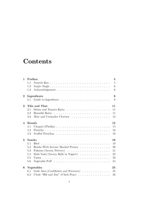 The document provides a guide to common ingredients used in Indian cooking. It defines 22 common Indian ingredients like asafoetida, besan, cardamom, coriander, cumin, dals, fennel seed, fenugreek, garam masala, chat masala, ghee, mustard oil, mint, pomegranate, saffron, and turmeric. It provides the Indian names for the ingredients and descriptions. It also includes a recipe for making garam masala, a common Indian spice mix.