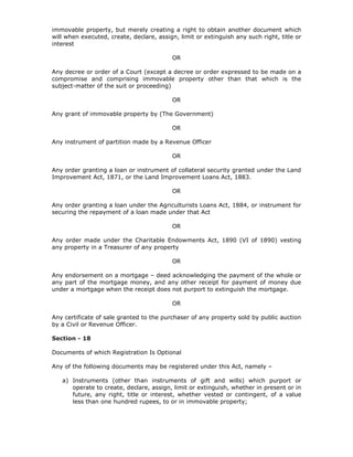 1) Section 17 lists documents of which registration is compulsory, including gifts of immovable property, leases over one year, and instruments related to rights over property valued over 100 rupees.