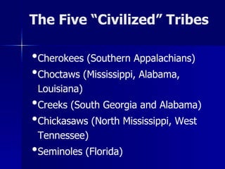 This document summarizes the forced removal of Native American tribes from the Southeast region of the United States in the 1830s under the Indian Removal Act. It outlines the five main tribes affected - the Cherokees, Choctaws, Creeks, Chickasaws, and Seminoles. It describes how the Cherokees and Choctaws lost their lands, with the Cherokees unsuccessfully fighting removal in the Supreme Court. It concludes that Indian removal was driven by non-Native Americans wanting their lands, not because the tribes refused to adopt Western ways.