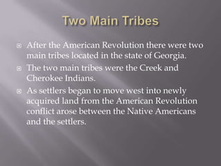 After settlers moved into Native American lands following the American Revolution, conflict arose between settlers and the Cherokee and Creek tribes located in Georgia. The Cherokee adapted more to white culture than other tribes, living in houses, farming, and owning slaves. In the 1820s, gold was discovered on Cherokee land, attracting over 10,000 settlers. Georgia then passed laws denying Cherokee rights to their lands. This led to the Cherokee's forced removal to Oklahoma along the "Trail of Tears" in 1838, despite the objections of Cherokee leader John Ross.