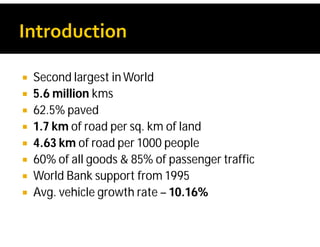 India possesses the second largest road network globally, covering 5.6 million kilometers, with a significant portion paved and a high percentage of goods and passenger traffic. Key developments include highway constructions, various road classifications managed by different authorities, and initiatives like PMGSY for rural road development. The Bharatmala project aims to enhance connectivity and logistics efficiency, with targets to improve existing corridors and connect more districts through national highways.