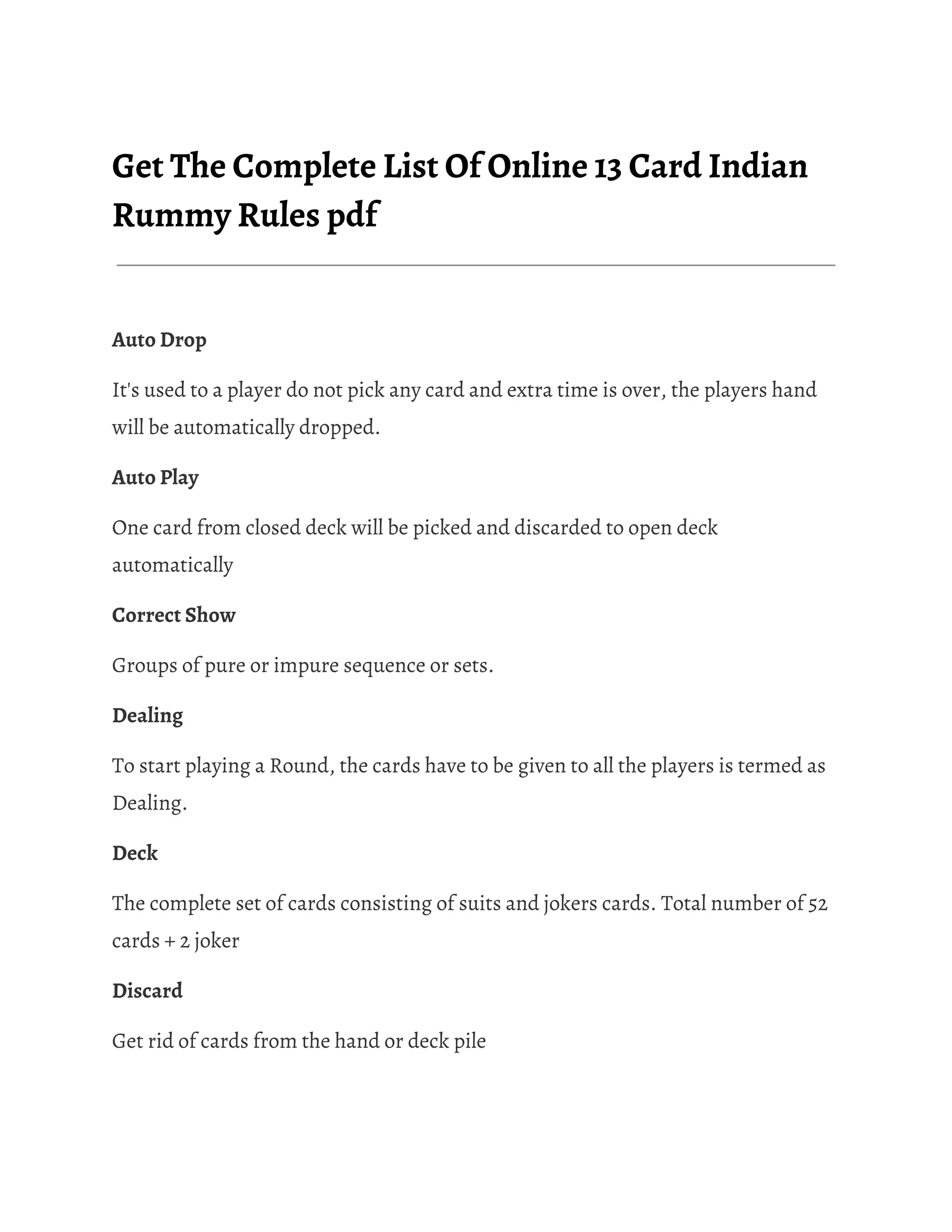 The document defines various terms related to online 13 card Indian rummy rules. It explains concepts like auto drop, auto play, correct show, dealing, deck, discard, disconnection, draw, drop, full count, group, impure sequence, joker, leave table, players count, pure sequence, rummy, set, shuffled, suits, table, validation rules, wild card, winner points, and wrong show. It also mentions that rummy is considered a legal skill-based game in India according to the Supreme Court.