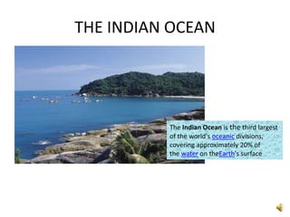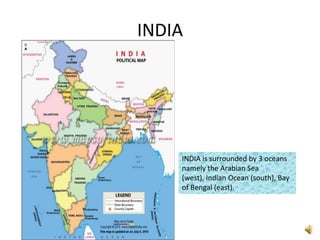 India is surrounded by three oceans - the Arabian Sea to the west, the Indian Ocean to the south, and the Bay of Bengal to the east. The Indian Ocean is the third largest ocean, covering 20% of the Earth's water surface. The Arabian Sea is bounded by Pakistan and Iran to the north, Somalia to the south, India to the east, and the Arabian Peninsula to the west. The Bay of Bengal forms the northeastern part of the Indian Ocean and is roughly triangular, bordered by India and Sri Lanka to the west, Bangladesh to the north, and Burma and the Andaman and Nicobar Islands to the east.