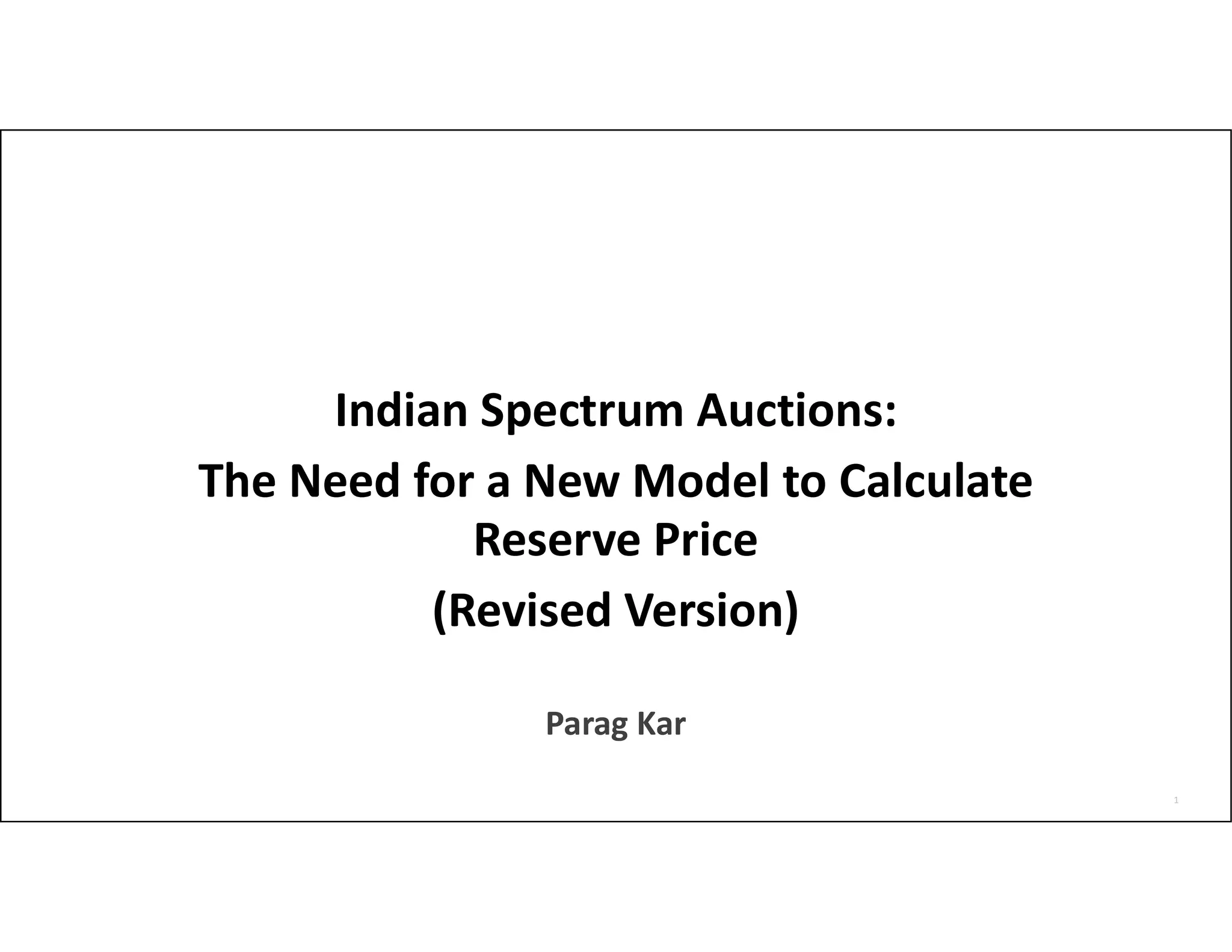 The document discusses the need for a revised model to calculate reserve prices in Indian spectrum auctions, highlighting past auction experiences and their implications on spectrum pricing. It identifies trends in auction prices, the impact of overenthusiastic bidding, and significant errors in price calculations that led to distorted spectrum prices. The author advocates for a more curated approach to setting reserve prices across different bands and circles to avoid unsold spectrum and maintain business continuity.