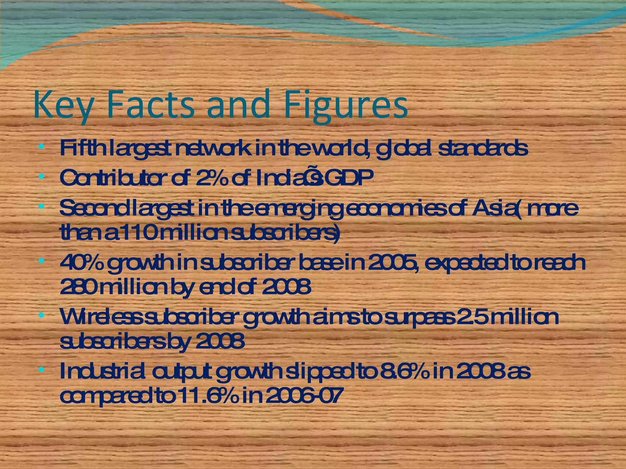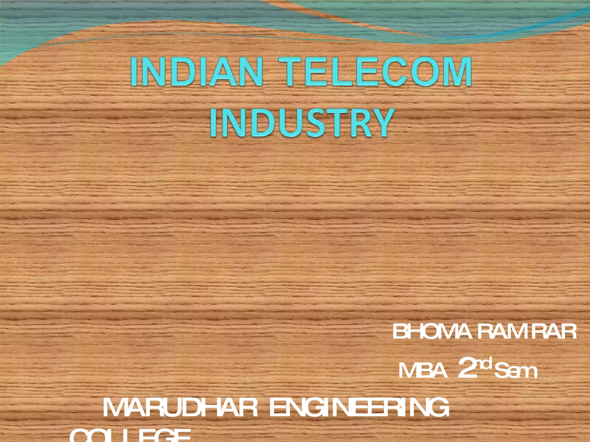 The Indian telecom industry is the fifth largest in the world and contributes 2% to India's GDP. It has experienced rapid growth in recent years, with wireless subscribers growing at 40% in 2005. The top players in the industry are Bharti Airtel and Reliance Communications, who together control nearly half the market. However, the industry faces challenges of high taxes and duties, difficulties expanding rural networks, and low average revenue per user.