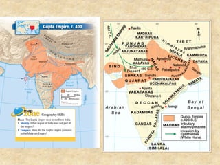 This document discusses Indian temple architecture from ancient times through the Gupta period. It notes that Gupta period temples were derived from earlier rock-cut prototypes, having wider spacing between columns in the middle and features like flat roofs and modest sizes. Key architectural elements of Hindu temples are described like the vimana, mandapa, and shikhara. Sculpture flourished during this time on a massive scale, though structures relied more on piling blocks than technical design. Gopurams, large entrance towers, came to mark the importance of temples within southern Indian cities.