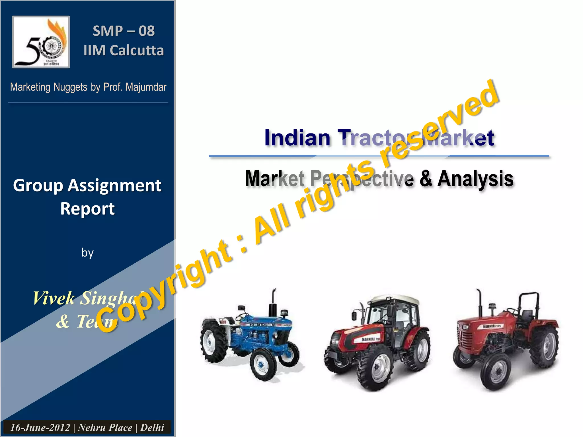 The document provides an analysis of the Indian tractor market, highlighting its significance in the agricultural sector and its contribution to India's GDP. It discusses market evolution, growth trends, segmentation, and consumer behavior while noting the dominance of key players like Mahindra & Mahindra. Future projections suggest continued growth driven by government initiatives and a shift towards higher-powered tractors due to labor scarcity and non-agricultural applications.