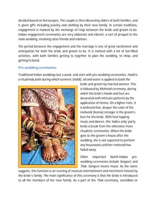 Indian weddings are elaborate cultural celebrations that typically last a week and involve many rituals and traditions. Arranged marriages are still common, though love marriages are increasing in urban areas. Weddings usually involve pre-wedding ceremonies like mehndi and sangeet parties. The multi-hour wedding ceremony itself includes rituals like kanyadaan, saat phere, and groom applying kumkum to the bride's forehead. Post-wedding traditions welcome the bride to her new home and conclude the wedding celebrations.
