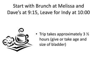 This document provides an itinerary for a weekend trip to Indianapolis over MLK/Presidents' Day weekend. It details plans for brunch, checking into the Hilton Indianapolis Hotel, having late lunch at Palomino restaurant, and offers several afternoon activity options. Evening plans include dinner and music at Slippery Noodle Blues Bar. Sunday activities include brunch at the Hilton and optional visits to the Canal Walk and NCAA Hall of Champions Museum.