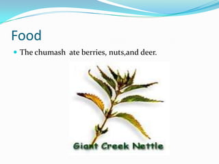 The Chumash people lived in the coastal region of California, where they ate berries, nuts, and deer. They lived in houses made of mud and straw and utilized natural resources like making bows, arrows, and canoes to travel on water.
