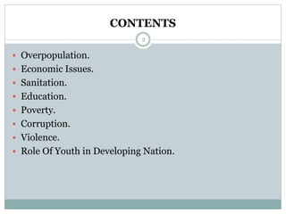 India faces many social challenges including overpopulation, economic issues, poor sanitation, inadequate education, poverty, corruption, and violence. The youth can help address these problems in several ways. They can start businesses to create jobs, spread awareness about social issues, and work to eliminate terrorism through non-violent means. If motivated and guided properly, young people have the energy, ideas, and willingness to help develop the nation.