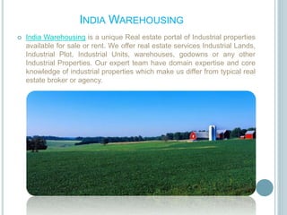India Warehousing is a real estate portal specializing in industrial properties like warehouses, factories, and godowns. They offer pre-engineered steel buildings manufactured using prefabricated steel components for flexible and durable construction. As a pre-engineered building manufacturer, they provide steel structures with primary and secondary members connected by sheeting. Key parameters in their pre-engineered building designs include length, height, roof slope, and accounting for design loads. They offer roofing and wall panel systems in galvalume or galvanized steel.