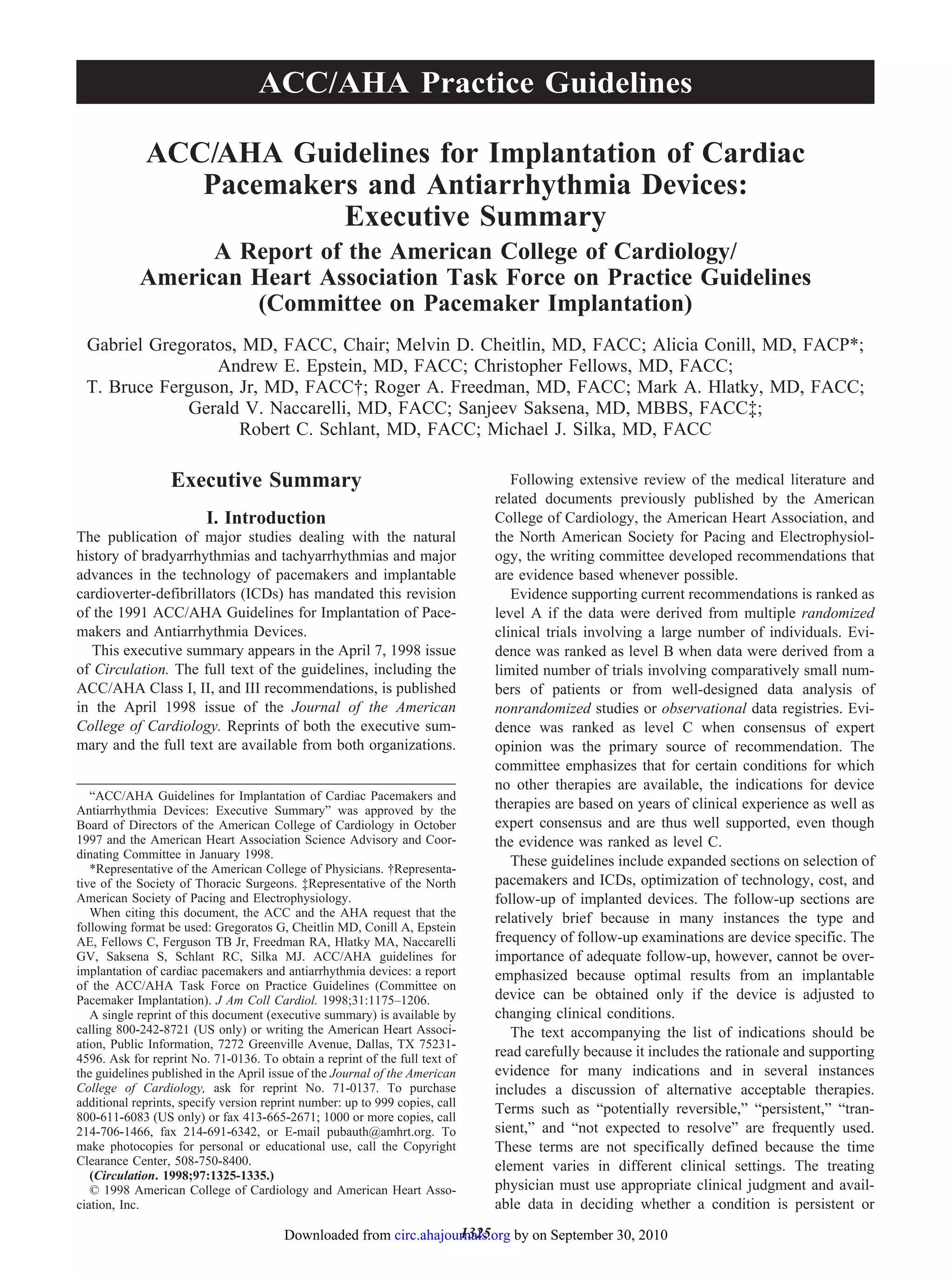 The ACC/AHA guidelines for cardiac pacemaker and antiarrhythmia device implantation were revised based on advances in technology and new clinical evidence. The guidelines provide evidence-based recommendations (level A, B, C evidence) on appropriate patient selection and device optimization. Indications for implantation were expanded based on studies showing risks of untreated bradyarrhythmias and benefits of pacing. The guidelines emphasize the importance of adequate long-term follow-up to ensure devices provide ongoing clinical benefit.