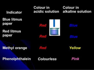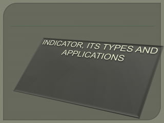 This document defines and describes various types of indicators used to determine the acidity, alkalinity or redox state of a solution. It discusses natural indicators like turmeric and litmus, as well as artificial pH indicators like methyl orange and phenolphthalein. It also covers complexometric, adsorption and universal indicators, and provides examples of how different indicators are used to test solutions and determine the endpoint in titration reactions.